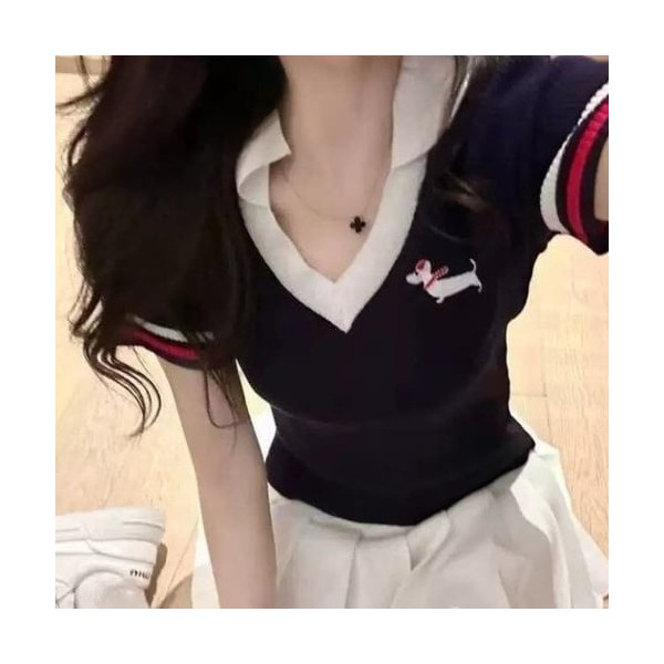 THOM BROWNE 톰브라운 브이 카라 배색 헥터 반팔 니트